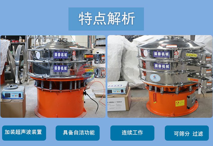 超聲波振動篩功能:該設(shè)備是旋振篩的一種衍生產(chǎn)品,將超聲波控制器與振動篩有機結(jié)合在一起,在振泰機械多年的研究生產(chǎn)的DH系列旋振篩的基礎(chǔ)上,在篩網(wǎng)上面疊加一個高頻率低振幅的超聲振動波,超微細(xì)粉體接受巨大的超聲加速度,使篩面上的物料始終保持懸浮狀態(tài),從而抑制粘附、摩擦、平降、楔入等堵網(wǎng)因素,從而解決了強吸附性、易團(tuán)聚、高靜電、高精細(xì)、高密度、輕比重等篩分難題,使超微細(xì)粉篩分不再成為難事,特別適合高品質(zhì)、精細(xì)粉體的用戶使用