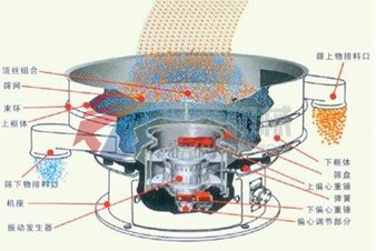 防腐塑料振動(dòng)篩采用YZUL立式振動(dòng)電機(jī)作為激振源,通過(guò)振動(dòng)電機(jī)上下兩端的偏心重錘將旋轉(zhuǎn)運(yùn)動(dòng)轉(zhuǎn)變?yōu)樗健⒋怪?、傾斜的三次元運(yùn)動(dòng),并傳遞到旋振篩的篩面上;物料通過(guò)入料口進(jìn)入設(shè)備內(nèi),根據(jù)不同物料篩分要求,物料經(jīng)過(guò)1-5層采用不同目數(shù)的金屬編織篩網(wǎng)的篩分層,在這個(gè)過(guò)程中,位于各層的篩網(wǎng)下的清網(wǎng)裝置(彈跳球)通過(guò)頻率振動(dòng)不斷撞擊不銹鋼篩網(wǎng),使篩網(wǎng)上層物料能夠順暢的透網(wǎng)篩分,并有效解決了物料堵網(wǎng)問(wèn)題出現(xiàn),不同目數(shù)的物料通過(guò)各層對(duì)應(yīng)目數(shù)的篩網(wǎng)后在各層的出料口排出,最終實(shí)現(xiàn)篩選除雜或過(guò)濾分級(jí)的目的。調(diào)節(jié)上、下兩端的相位角,可以改變物料在篩面上的運(yùn)動(dòng)軌跡,具體如下圖: